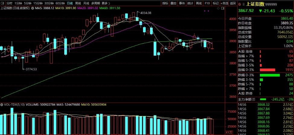 截至收盘,上证指数报收3867.92点,下跌0.55%;深证成指报收13112.09点,下跌1.1%;创业板指报收3137.8点,下跌1.77%。市场成交量出现明显萎缩。