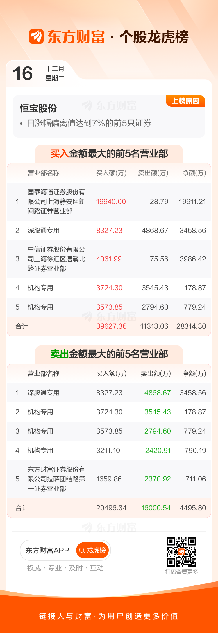 交易所2025年12月16日公布的交易公开信息显示,恒宝股份因成为日涨幅偏离值达到7%的前5只证券上榜。恒宝股份当日收报20.38元,涨跌幅9.98%,偏离值11.50%,换手率19.25%,成交额22.64亿。