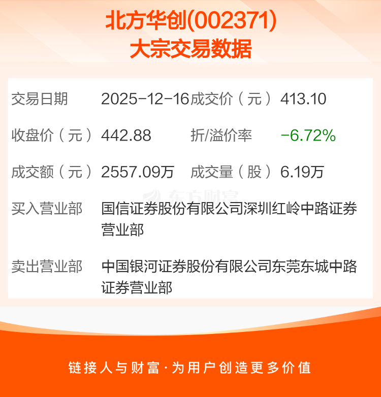 大宗交易:北方华创成交2557.09万元,折价6.72%(12-16)