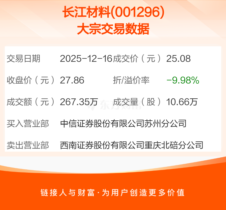 2025年12月16日,长江材料发生1笔大宗交易,共成交10.66万股,成交金额267.35万元,占其流通市值比例为0.12%