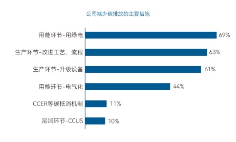 从能源成本优化方面来看,企业通过优化能源结构和提升能源效率来降低成本。调研显示,近70%的受访企业通过在“用能环节使用绿色”来减少碳排放,是受访企业最常用的减排措施;超过60%的受访企业通过生产环节“改进工艺、流程”“升级设备”等提升能源使用效率来实现减排。