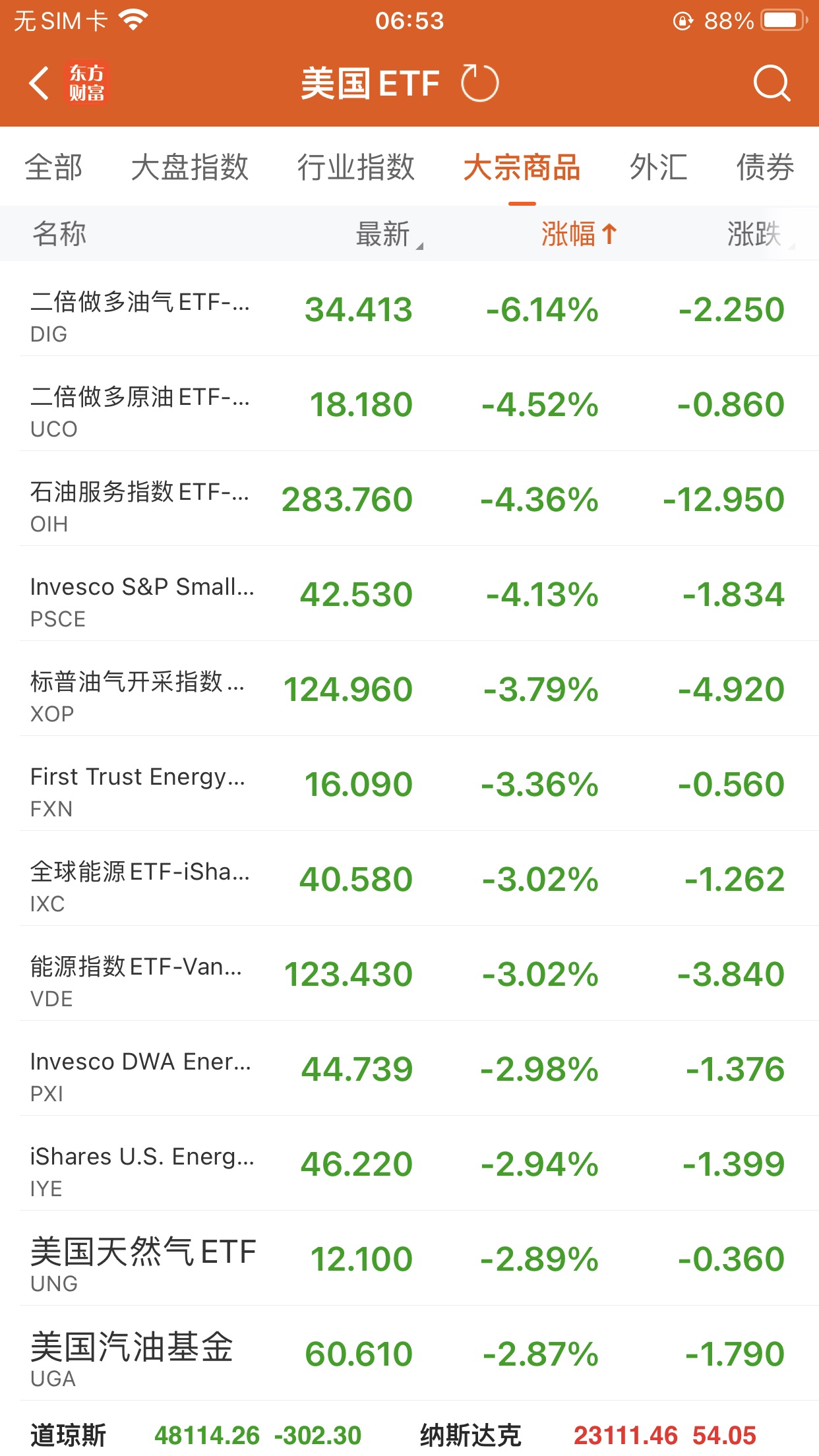 2倍做多标普能源行业指数ETF-ProShares (DIG.US) 跌6.14%,成交额166.55万美元。