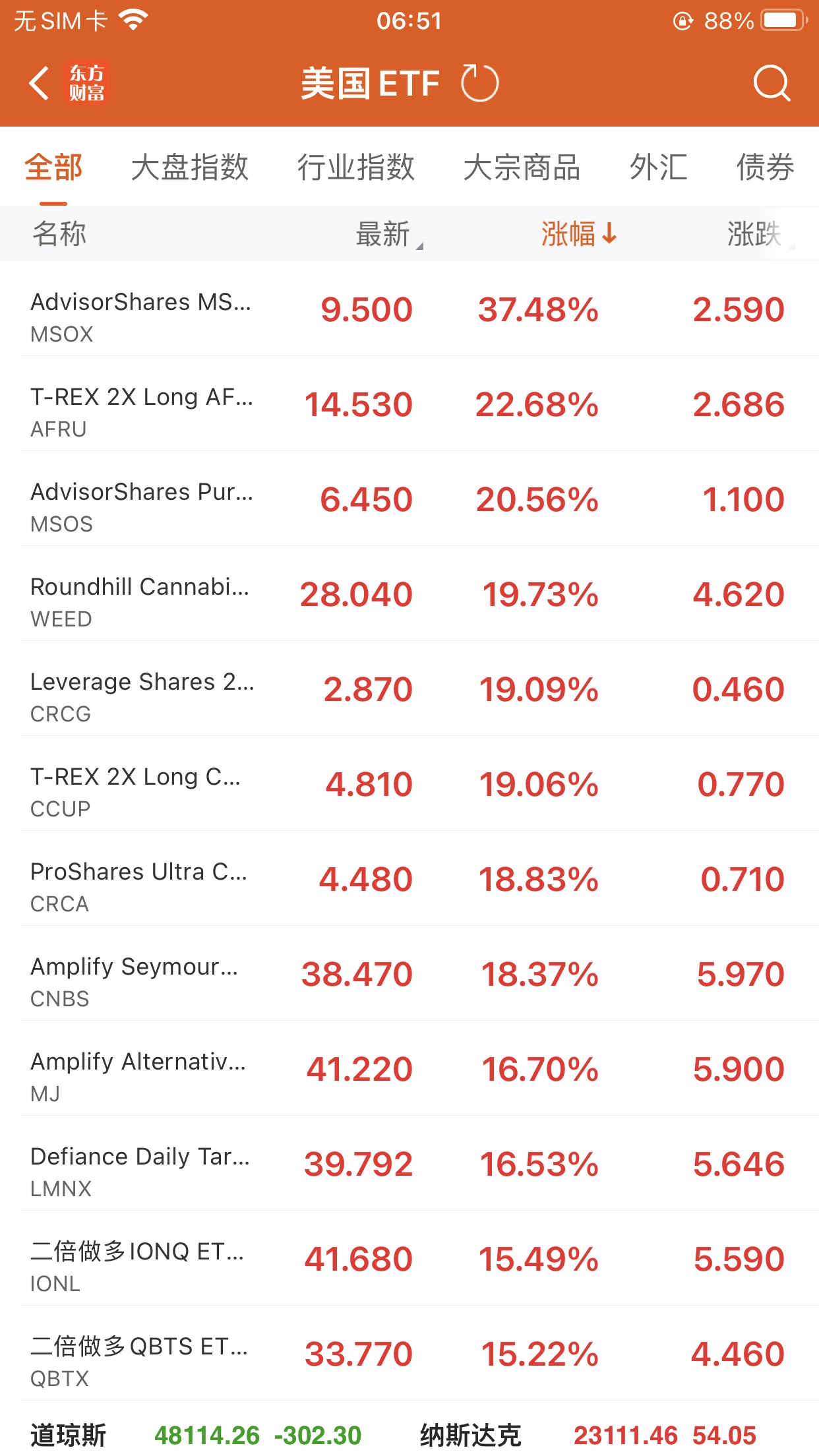 美股ETF升幅榜Top5AdvisorShares MSOS Daily Leveraged ETF (MSOX.US) 升37.48%,成交额4468.52万美元。