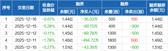 融资方面,当日融资买入686.88万元,融资偿还722.91万元,融资净偿还36.03万元,连续13日净偿还累计3216.52万元。融券方面,融券卖出300股,融券偿还200股,融券余量500股,融券余额8995元。融资融券余额合计1.44亿元。