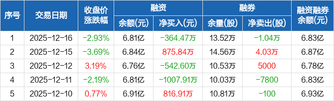 融资方面,当日融资买入1916.68万元,融资偿还2281.16万元,融资净偿还364.47万元。融券方面,融券卖出3600股,融券偿还1.4万股,融券余量13.52万股,融券余额232.95万元。融资融券余额合计6.83亿元。