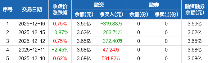 融资方面,当日融资买入3327.16万元,融资偿还3647.04万元,融资净偿还319.88万元,连续3日净偿还累计956万元。融券方面,融券卖出0份,融券偿还0份,融券余量0份,融券余额0元。融资融券余额合计3.59亿元。