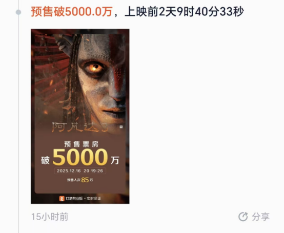 《阿凡达3》于12月12日开启预售。灯塔专业版数据显示,截至12月17日11时,《阿凡达3》预售及点映票房约5770万元,其预售突破5000万元的具体时间为12月16日晚,距离上映仅2天9小时。