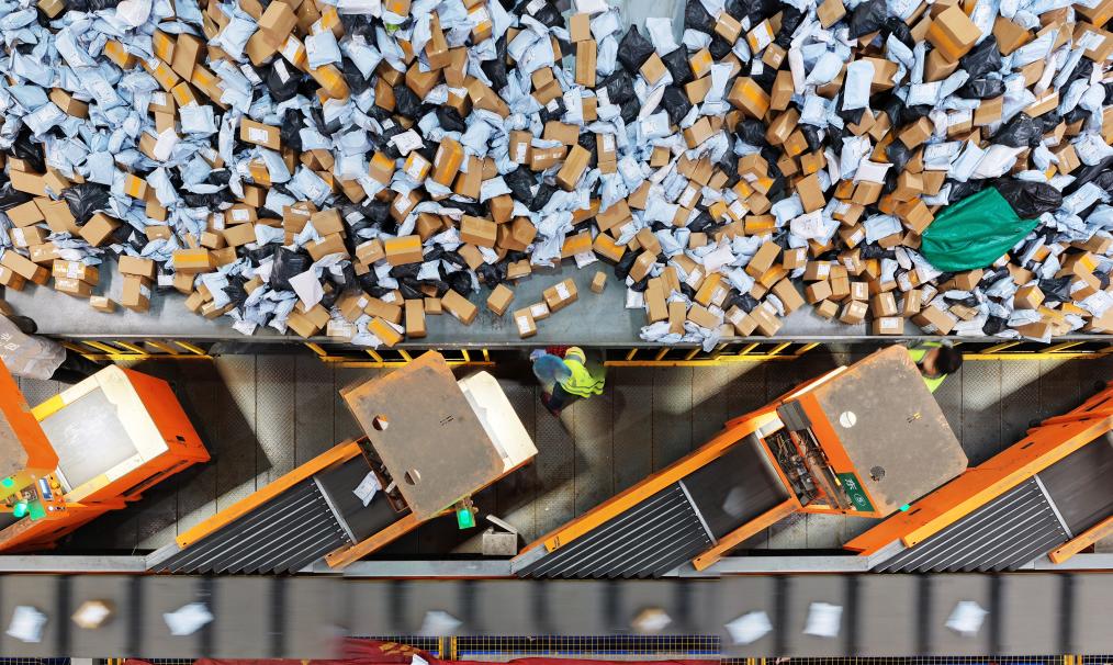 11月10日,在中国邮政集团有限公司江苏扬州邮件处理中心,工作人员在分拣快递包裹(无人机照片)。新华社发(孟德龙摄)
