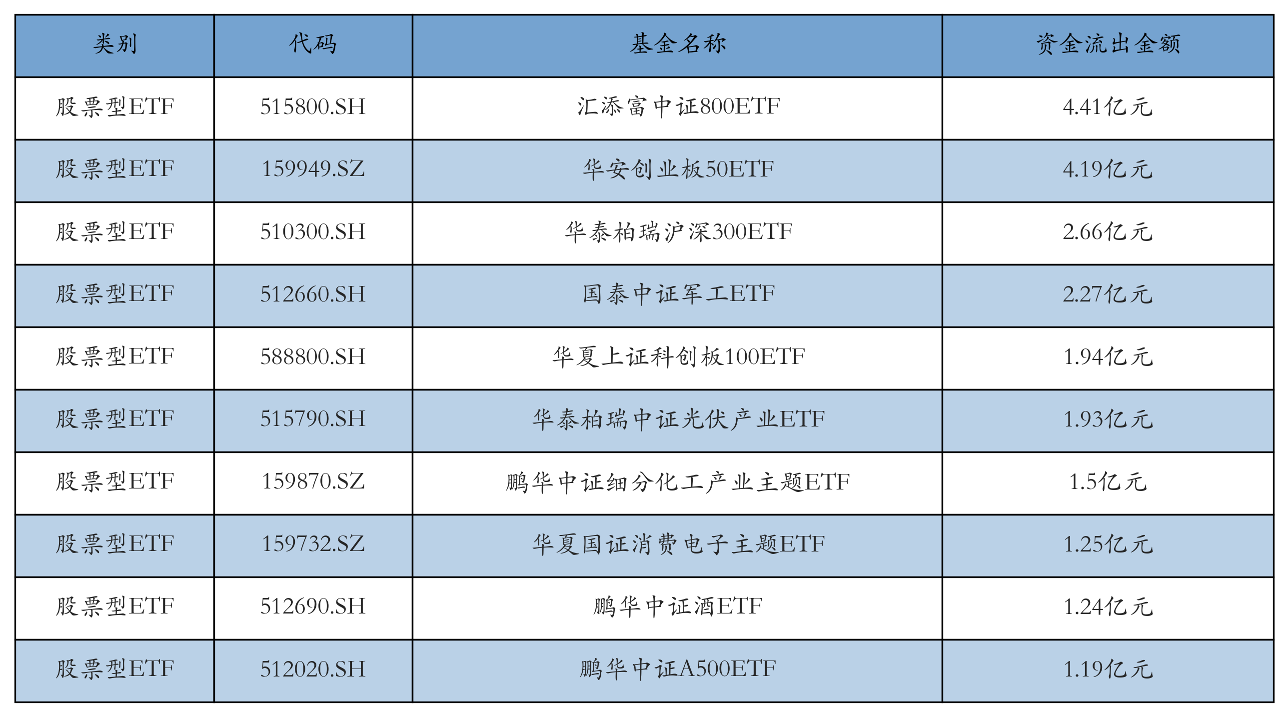 昨日股票型ETF资金流出最多的3只ETF及其流出金额分别为:汇添富中证800ETF(流出4.41亿元)、华安创业板50ETF(流出4.19亿元)、华泰柏瑞沪深300ETF(流出2.66亿元)。资金流出前10详情见下表: