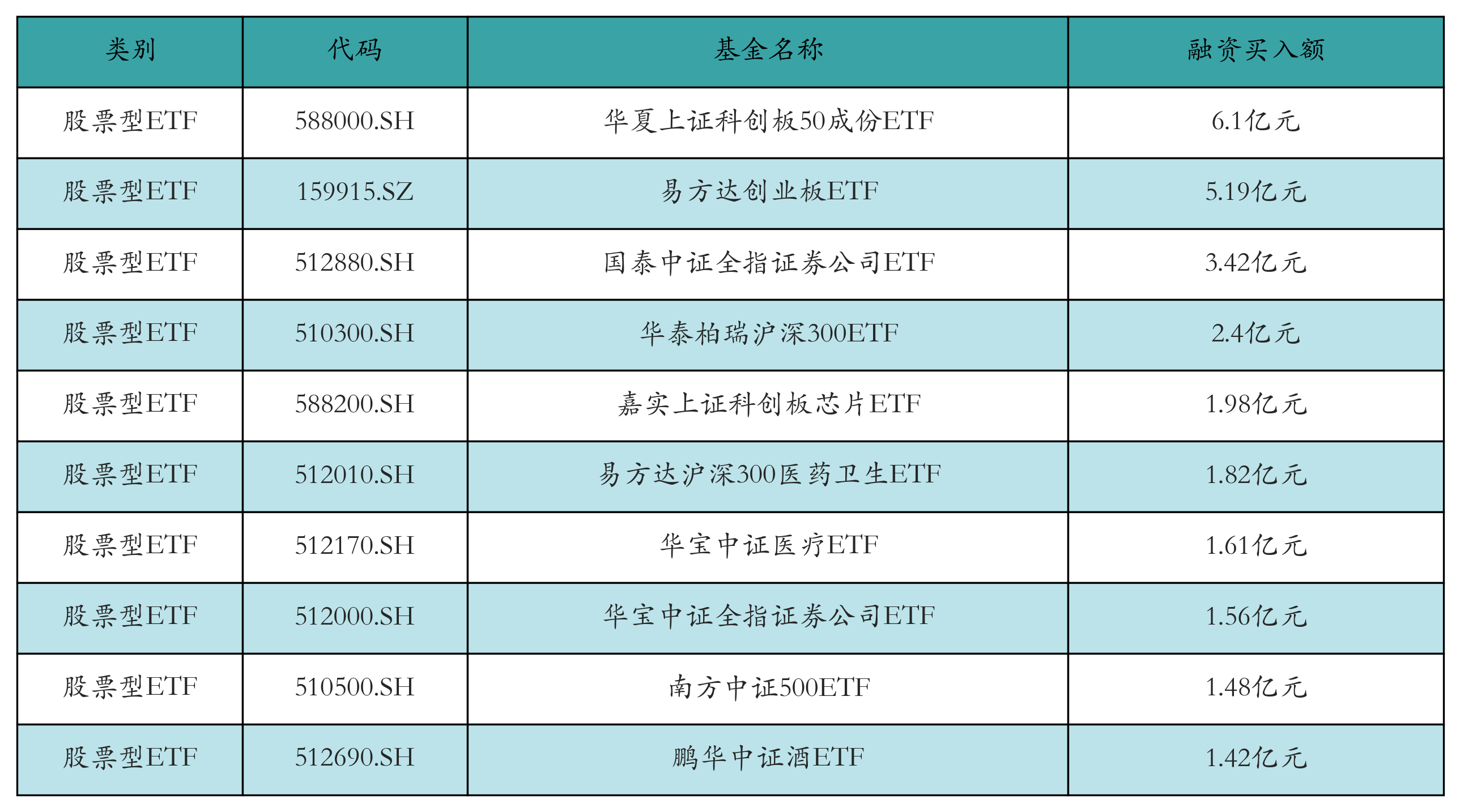 昨日股票型ETF融资买入额最高的3只ETF及其买入金额分别为:华夏上证科创板50成份ETF(6.1亿元)、易方达创业板ETF(5.19亿元)、国泰中证全指证券公司ETF(3.42亿元)。融资买入额前10详情见下表:
