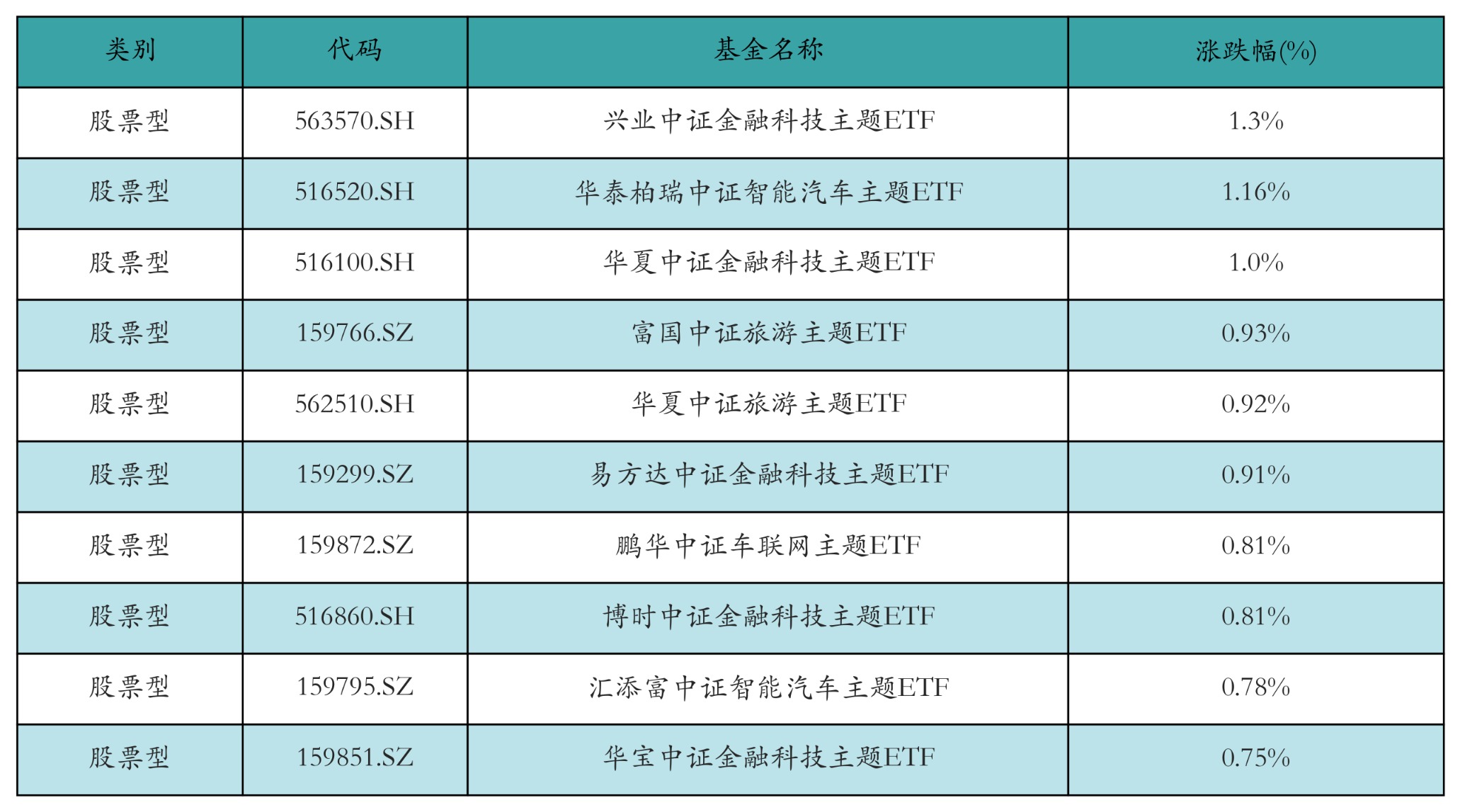 昨日股票型ETF涨幅最高的3只ETF及其收益率分别为:兴业中证金融科技主题ETF(1.3%)、华泰柏瑞中证智能汽车主题ETF(1.16%)、华夏中证金融科技主题ETF(1.0%)。涨幅前10详情见下表: