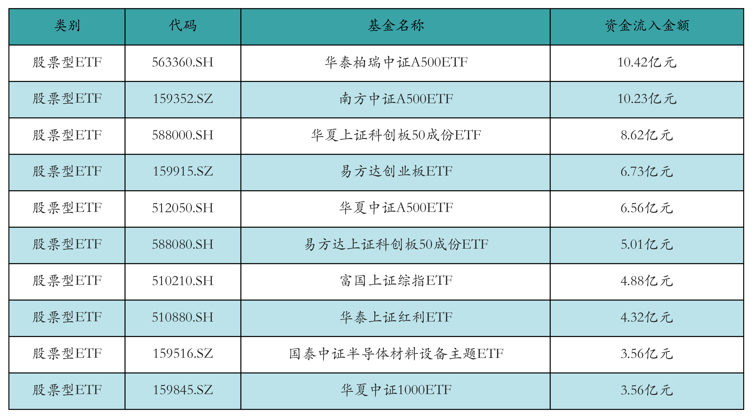 昨日股票型ETF资金流入最多的3只ETF及其流入金额分别为:华泰柏瑞中证A500ETF(流入10.42亿元)、南方中证A500ETF(流入10.23亿元)、华夏上证科创板50成份ETF(流入8.62亿元)。资金流入前10详情见下表: