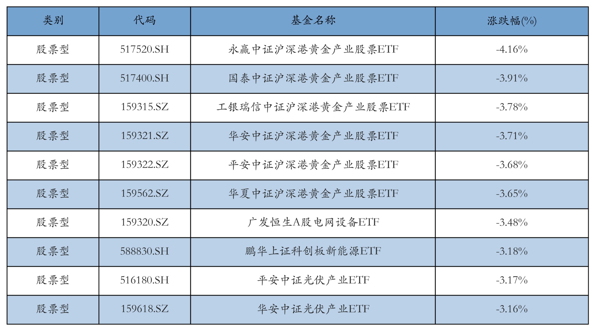 昨日股票型ETF跌幅最大的3只ETF及其收益率分别为:永赢中证沪深港黄金产业股票ETF(-4.16%)、国泰中证沪深港黄金产业股票ETF(-3.91%)、工银瑞信中证沪深港黄金产业股票ETF(-3.78%)。跌幅前10详情见下表: