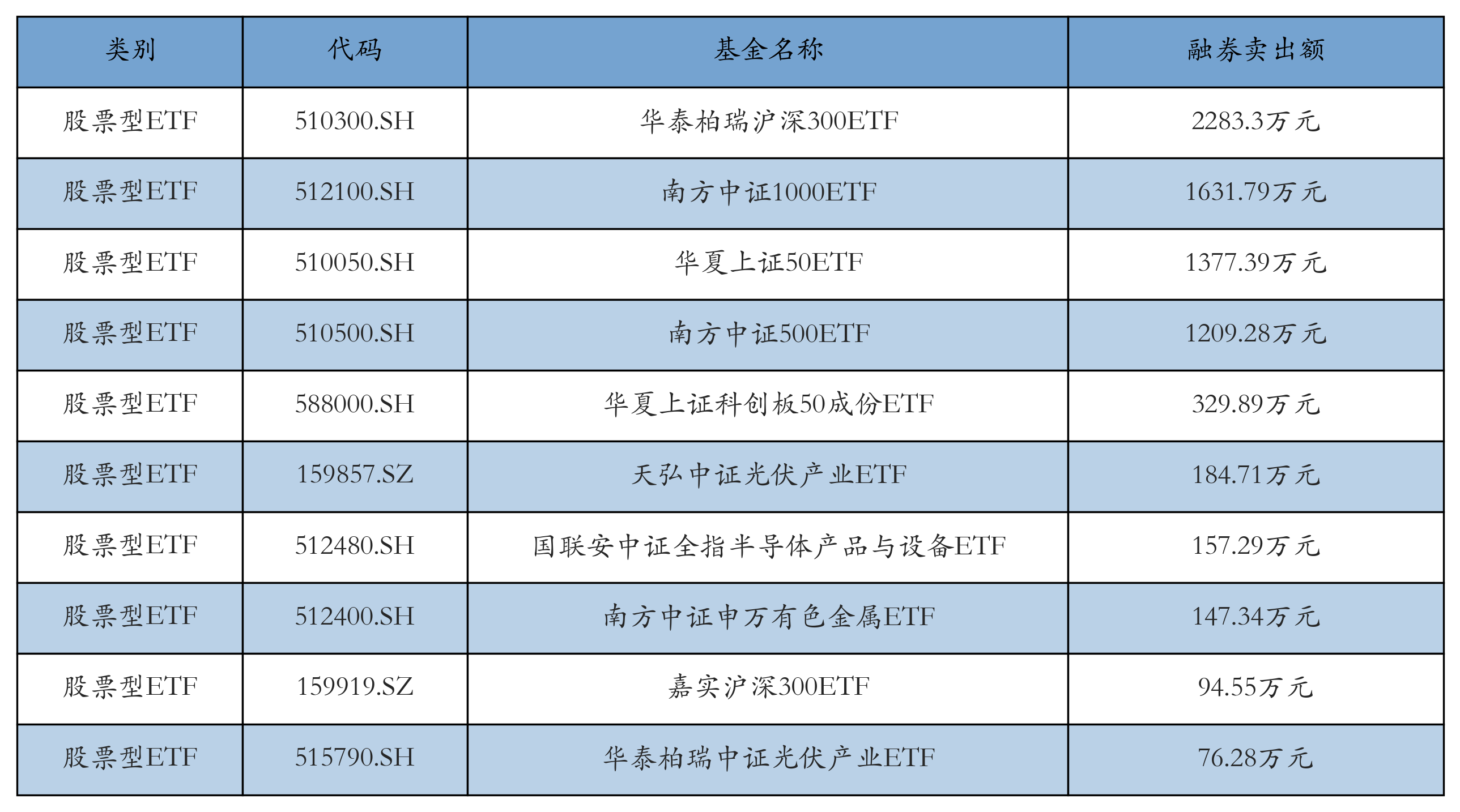 昨日股票型ETF融资卖出额最高的3只ETF及其卖出金额分别为:华泰柏瑞沪深300ETF(2283.3万元)、南方中证1000ETF(1631.79万元)、华夏上证50ETF(1377.39万元)。融券卖出额前10详情见下表: