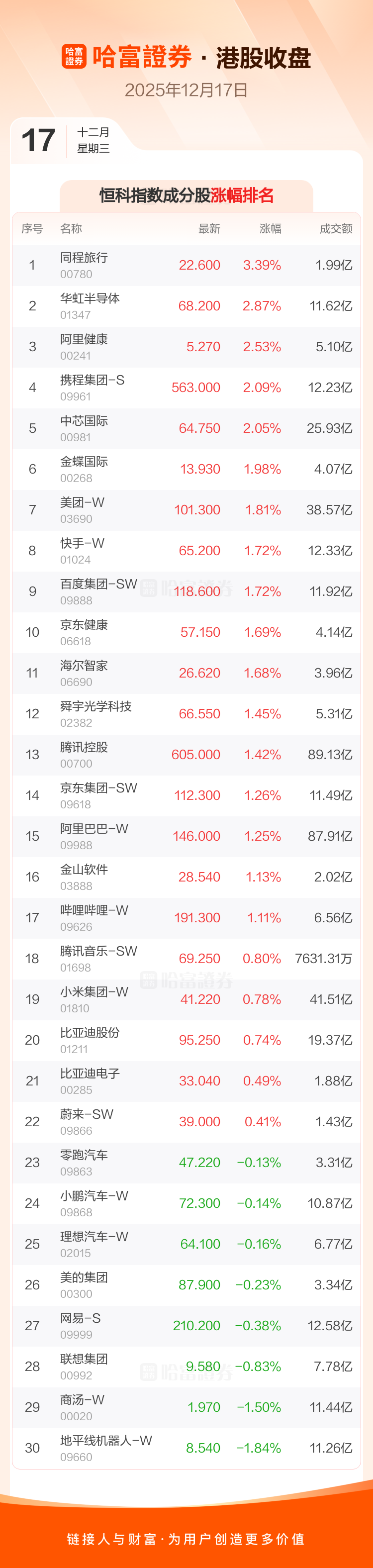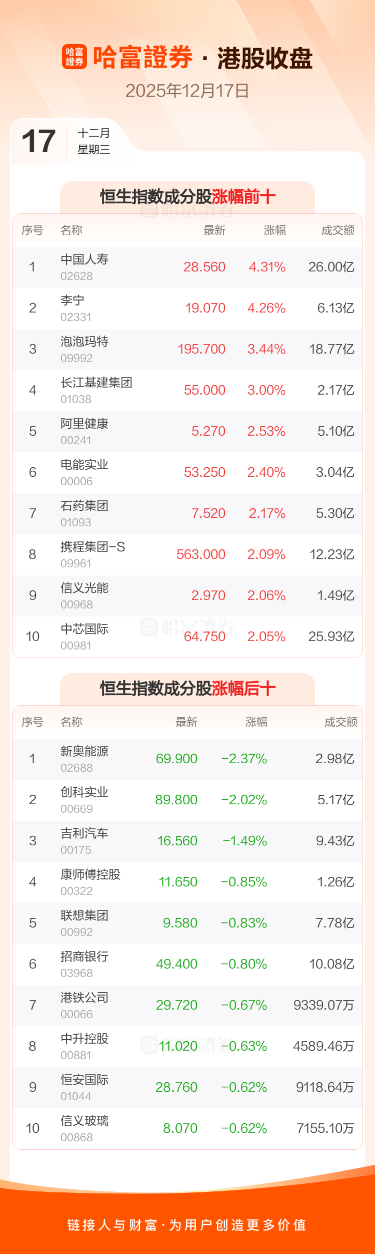 港股12月17日收盘走高,恒生指数收报25468.78点,涨233.37点,涨幅0.92%;恒生科技指数收报5457.95点,涨55.44点,涨幅1.03%。恒生指数成分股中中国人寿、李宁、泡泡玛特涨幅居前,新奥能源、创科实业、吉利汽车跌幅靠前。恒生科技指数成分股中同程旅行、华虹半导体、阿里健康涨幅居前,地平线机器人-W、商汤-W、联想集团跌幅靠前。