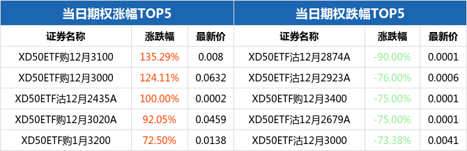50ETF期权当日有172个合约正在交易。从涨跌幅来看,50ETF期权合约中,XD50ETF购12月3100涨幅最大,为135.29%,报收0.008元;XD50ETF沽12月2874A跌幅最大,为90.00%,报收0.0001元。