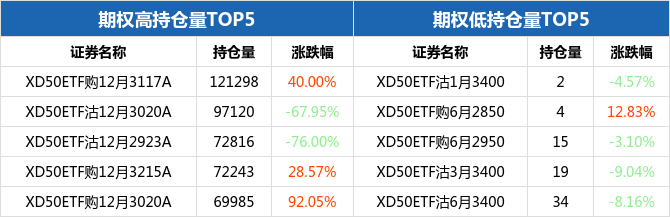 从持仓量来看,50ETF期权合约中,XD50ETF购12月3117A持仓量最大,为121298张,期权全日上涨40.00%,报收0.0042元;持仓量最小的为XD50ETF沽1月3400,共计2张,期权全日下跌4.57%,报收0.3609元。
