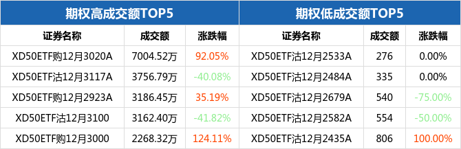 从成交额来看,50ETF期权合约中,XD50ETF购12月3020A成交额最高,为7004.52万元,全日上涨92.05%,报收0.0459元;而最低的为XD50ETF沽12月2533A,成交额为276元,全日收平,报收0.0001元。