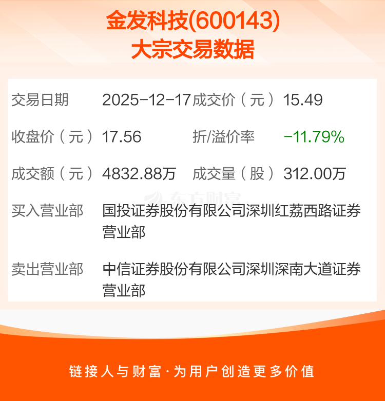 大宗交易:金发科技成交4832.88万元,折价11.79%(12-17)