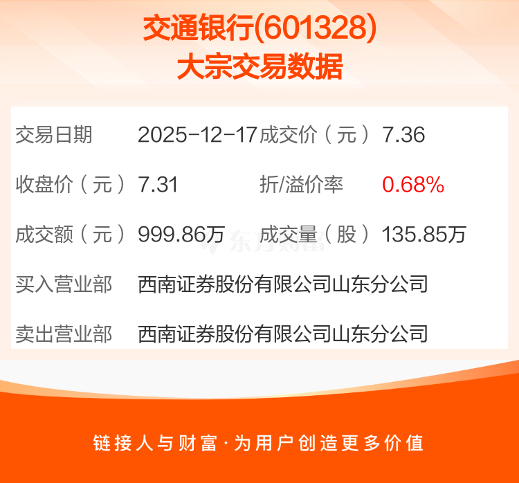 2025年12月17日,交通银行发生1笔大宗交易,共成交135.85万股,成交金额999.86万元。