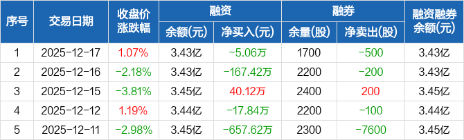 富满微:融资净偿还5.06万元,融资余额3.43亿元(12-17)