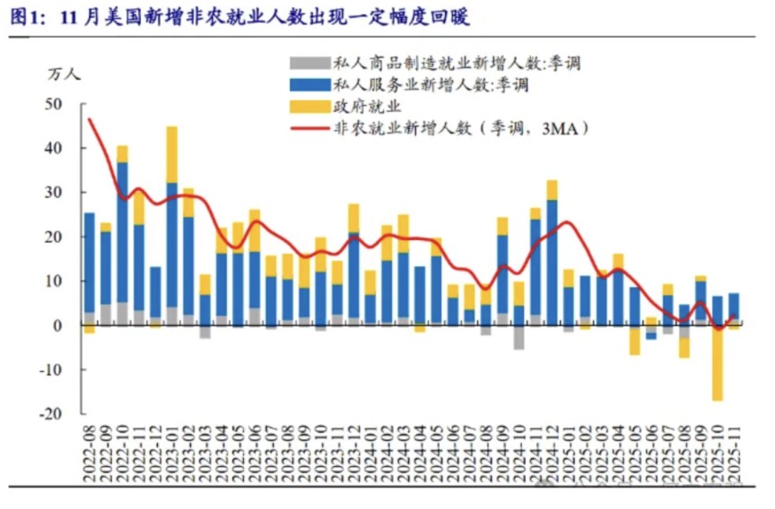 2025年11月美国新增非农就业人数和失业率均超预期。10月新增非农就业人数大幅减少,原因是部分接受“延迟辞职”方案的美国联邦政府雇员退出了工资单,导致政府部门拖累整体读数。鲍威尔给非农“官方打折”,11月新增非农就业谈不上强劲。“低招聘”延续,但“低裁员”在10月和11月有所变化。不过就12月美股公司提到“Job Cuts”的次数来看,裁员规模并未恶化。若12月失业率不继续上升,则我们预计美联储仍会认为政策利率“well positioned”。我们维持此前观点,预计美联储将在明年1月暂停降息,剩余两次鲍威尔作为主席的议息会议可能还有一次25bps降息。