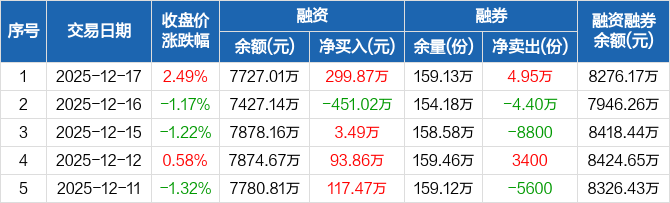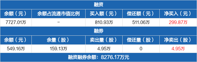 融资方面,当日融资买入810.93万元,融资偿还511.06万元,融资净买入299.87万元。融券方面,融券卖出4.95万份,融券偿还0份,融券余量159.13万份,融券余额549.16万元。融资融券余额合计8276.17万元。