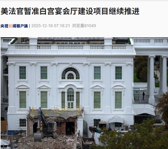 据央视新闻12月18日消息,央视记者当地时间12月17日获悉,美国一名联邦法官裁定,总统特朗普目前可继续推进在白宫东翼原址建设大型宴会厅的计划,驳回了美国一文物保护组织对该项目提出的紧急叫停申请。