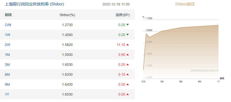 隔夜shibor报1.2730%,下跌0.20个基点;7天shibor报1.4260%,下跌0.20个基点;14天shibor报1.5820%,上涨11.10个基点;1月shibor报1.5500%,上涨0.90个基点;3月shibor报1.6030%,上涨0.20个基点。