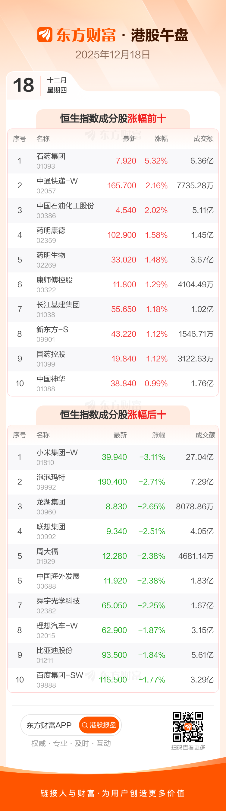 港股12月18日午盘走低,恒生指数收报25357.64点,跌111.14点,跌幅0.44%;恒生科技指数收报5389.42点,跌68.53点,跌幅1.26%。恒生指数成分股中石药集团、中通快递-W、中国石油化工股份涨幅居前,小米集团-W、泡泡玛特、龙湖集团跌幅靠前。恒生科技指数成分股中中芯国际、零跑汽车、阿里健康涨幅居前,商汤-W、小米集团-W、金蝶国际跌幅靠前。