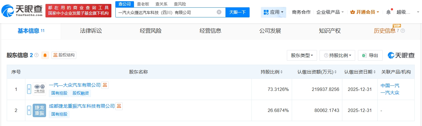 每经AI快讯,天眼查工商信息显示,近日,一汽大众捷达汽车科技(四川)有限公司成立,法定代表人为聂强,注册资本30亿元人民币,经营范围包括汽车零部件及配件制造、电动机制造、智能车载设备制造、道路机动车辆生产等。股东信息显示,该公司由一汽—大众汽车有限公司、成都捷龙重振汽车科技有限公司共同持股。