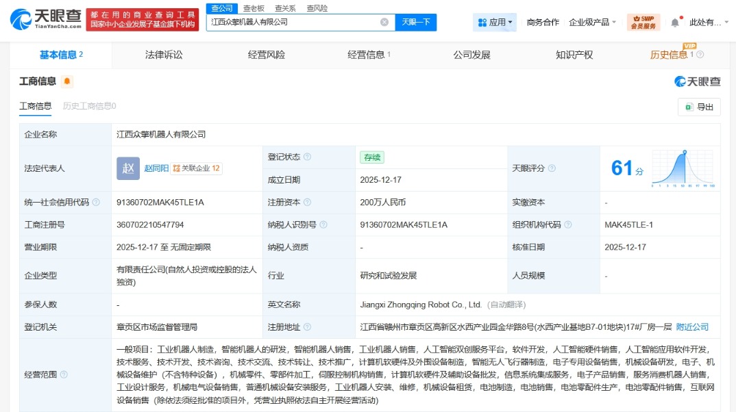 南方财经12月18日电,天眼查App显示,近日,江西众擎机器人有限公司成立,法定代表人为赵同阳,注册资本200万人民币,经营范围含工业机器人制造、智能机器人的研发、智能机器人销售、人工智能双创服务平台、人工智能应用软件开发、智能无人飞行器制造、电子专用设备销售、电池零配件生产、互联网设备销售等,由深圳市众擎机器人科技有限公司全资持股。