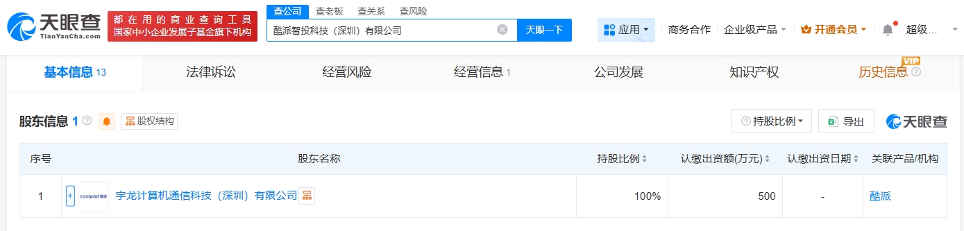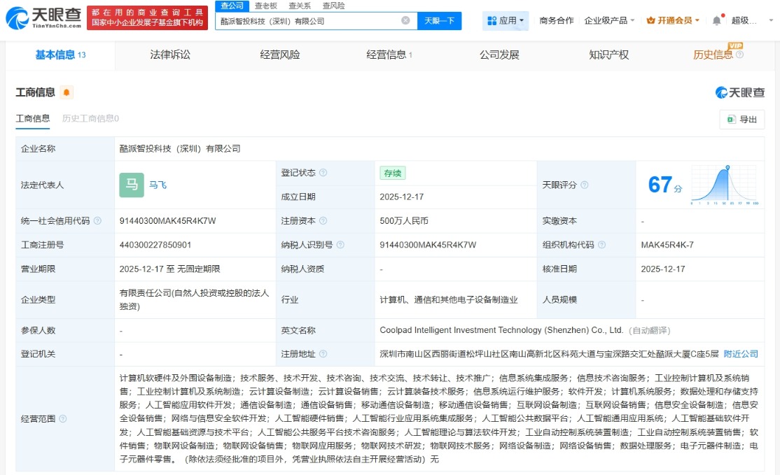 每经AI快讯,天眼查App显示,近日,酷派智投科技(深圳)有限公司成立,法定代表人为马飞,注册资本500万元人民币,经营范围包括计算机软硬件及外围设备制造、人工智能应用软件开发、人工智能行业应用系统集成服务、人工智能公共数据平台等。股东信息显示,该公司由酷派关联公司宇龙计算机通信科技(深圳)有限公司全资持股。