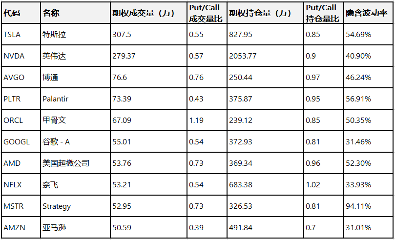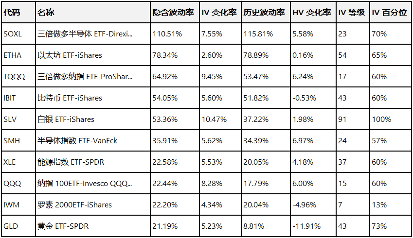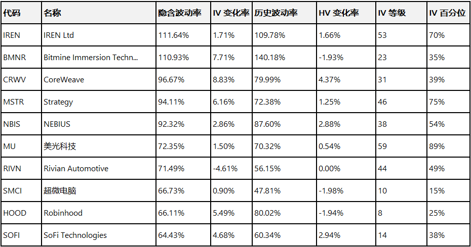 美股期权波动率排行榜前十(标的市值>100亿美元,且期权成交量>10万张)