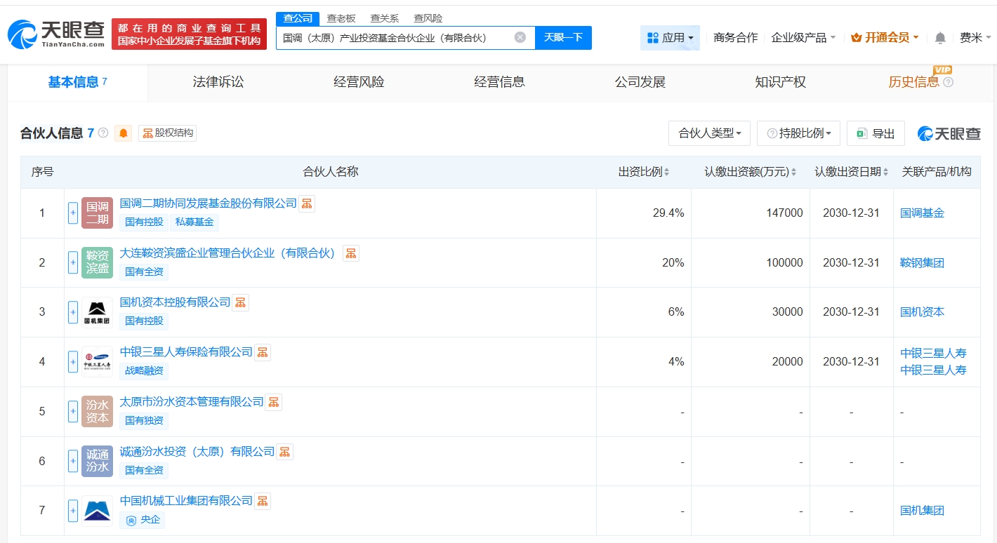 每经AI快讯,天眼查App显示,近日,国调(太原)产业投资基金合伙企业(有限合伙)成立,执行事务合伙人为诚通汾水投资(太原)有限公司,出资额50亿元人民币,经营范围为以私募基金从事股权投资、投资管理、资产管理等活动,由国调二期协同发展基金股份有限公司、鞍钢集团旗下大连鞍资滨盛企业管理合伙企业(有限合伙)、国机资本控股有限公司等共同出资。据媒体报道,该基金将立足太原市新兴产业发展现状,聚焦电子信息制造、新材料、新能源等六大核心产业,推动央企在晋项目,支持相关产业链初创企业成长。