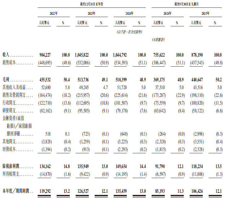 财务数据显示,未来穿戴收入从2022年的9.04亿元增长至2023年的10.46亿元,2024年微微减少至10.45亿元。截至2025年9月30日止九个月,其收入达8.78亿元,净利润由2022年的1.19亿元增至2023年的1.27亿元,2024年进一步增长至1.35亿元。截至2025年9月30日止九个月,其净利润达1.06亿元。