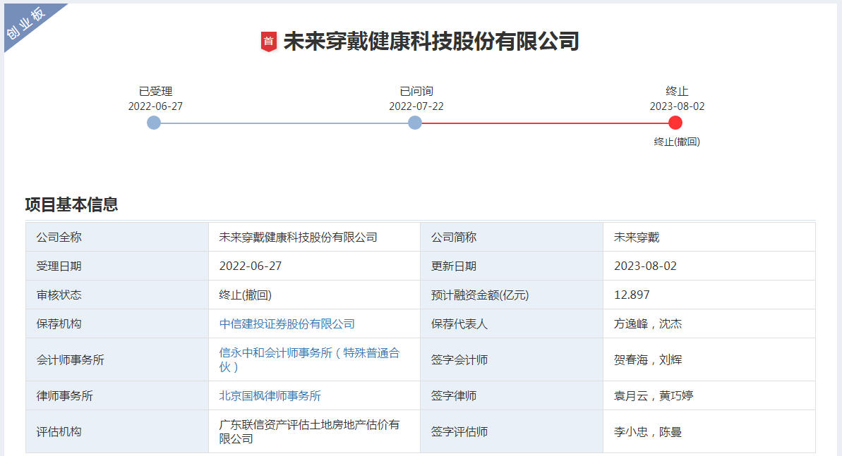 几个月后,未来穿戴称,鉴于公司战略发展需要,经与中信建投友好协商,公司于7月31日与中信建投签署了《终止协议》,中信建投于8月1日向深圳证监局报送了终止辅导备案的申请材料,深圳证监局于8月5日确认公司终止辅导。