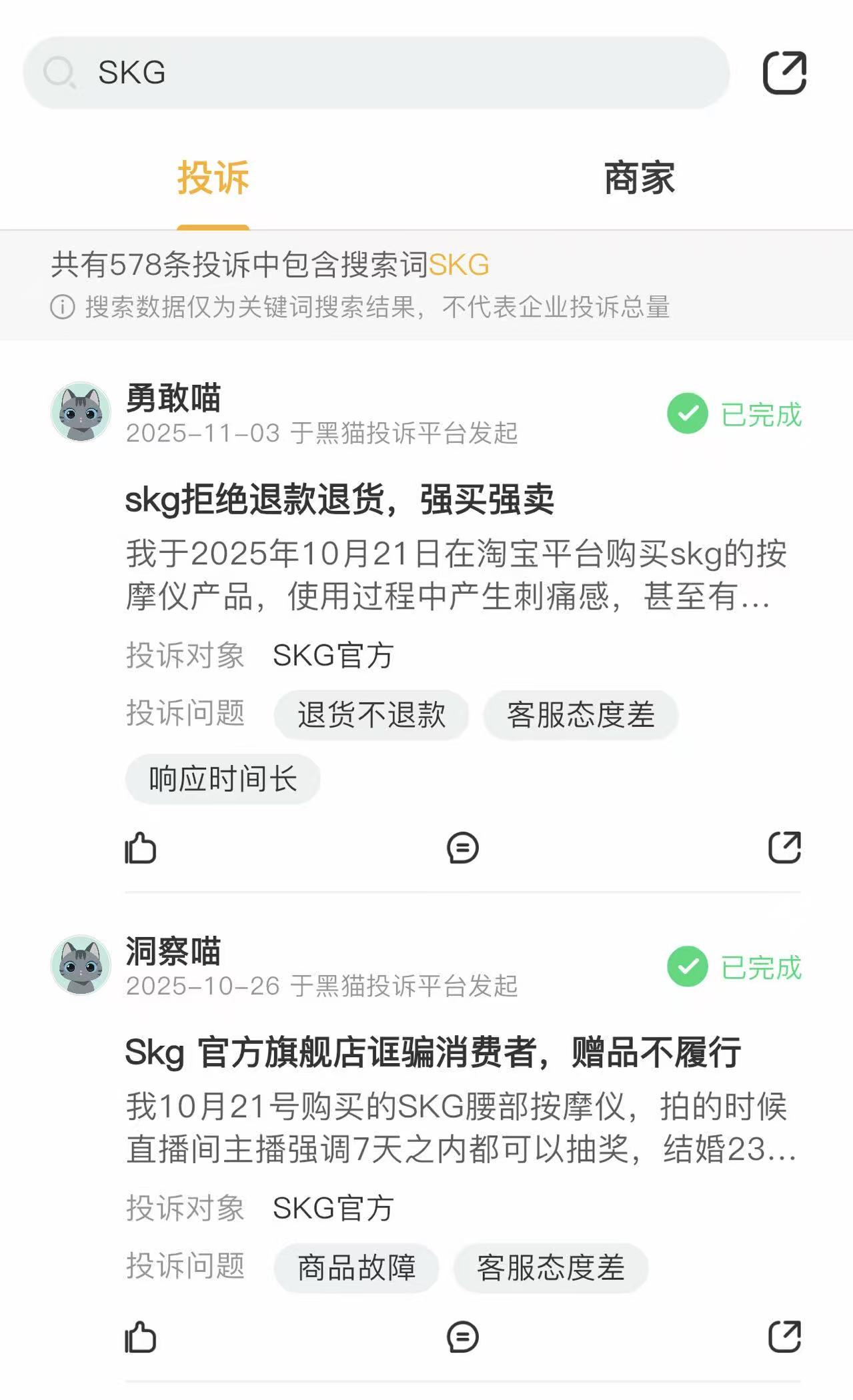 截至发稿,在黑猫投诉平台上,共有578条投诉中包含“SKG”关键词。
