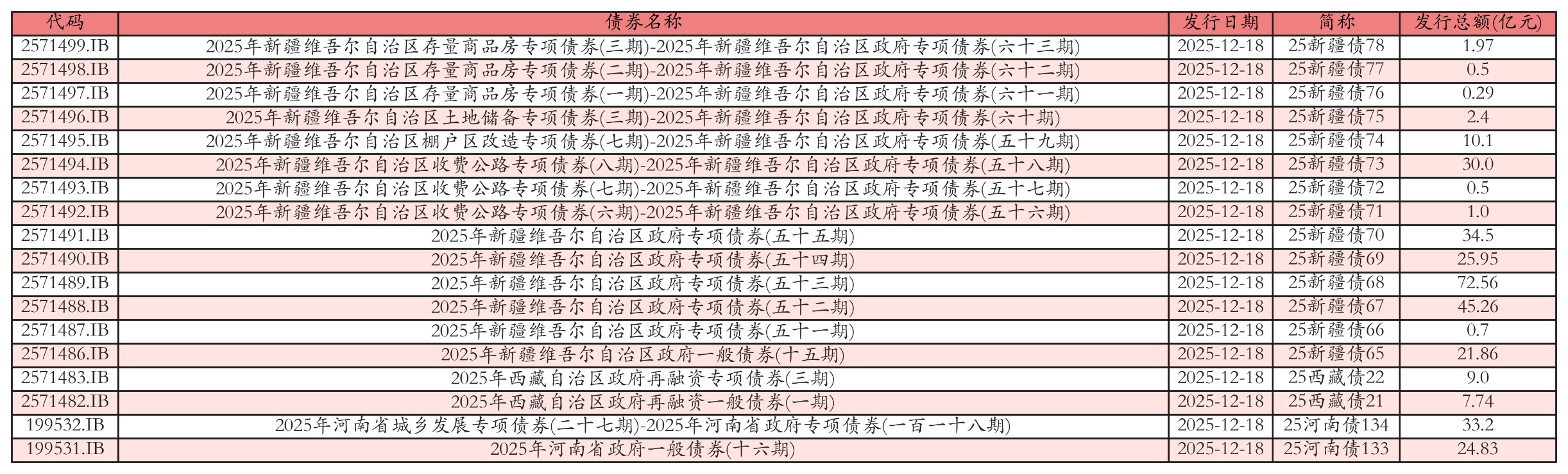 南财智讯12月18日电,南财金融终端数据显示,2025年12月18日全国共发行18只地方政府债,共计322.36亿元。其中,政府一般专项债发行3只,共54.43亿元;地方政府专项债发行15只,共267.93亿元。各地方政府所发行债券中,25新疆债68、25河南债134、25西藏债22发行规模靠前,发行金额分别为72.56亿元、33.2亿元、9.0亿元。投标方面,各地方政府所发行债券中,25新疆债68、25河南债134、25西藏债22全场中标倍数靠前。其中:25新疆债68全场中标倍数为19.7,全场中标利率为2.38%,边际倍数为16.73;25河南债134全场中标倍数为27.71,全场中标利率为2.42%,边际倍数为6.06;25西藏债22全场中标倍数为23.01,全场中标利率为1.68%,边际倍数为1.41。今日发行地方政府债详情如下表: