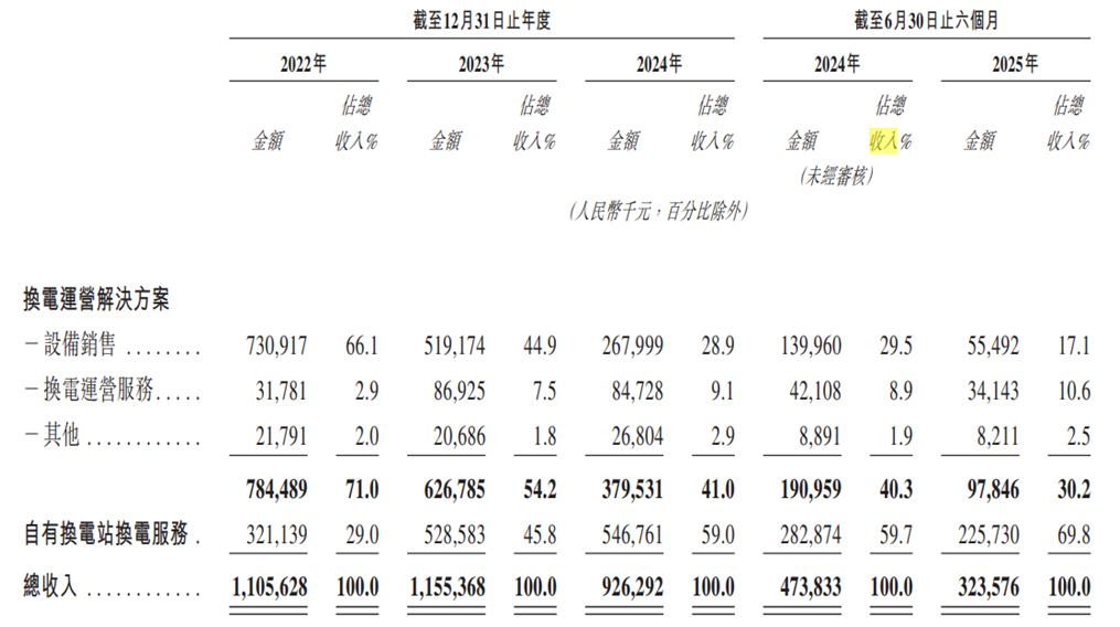 尽管公司不断深耕换电服务领域,但在整体财务表现上仍面临显著挑战。公司招股书显示,2022年至2024年及截至2025年6月30日,公司营业收入分别为11.06亿元、11.55亿元、9.26亿元和3.24亿元,呈现增长乏力甚至下滑态势。公司营收下滑的核心原因是原支柱业务——换电设备销售的大幅收缩。该业务收入占比从2022年的66.1%骤降至2025年上半年的17.1%,而同期公司的自有换电服务收入占比虽有大幅上升,但增量不足以覆盖设备销售的缺口。更触目惊心的是公司连年亏损,同期公司净亏损分别为7.85亿元、6.55亿元、4.19亿元和1.57亿元,三年半累计亏损约20.16亿元。
