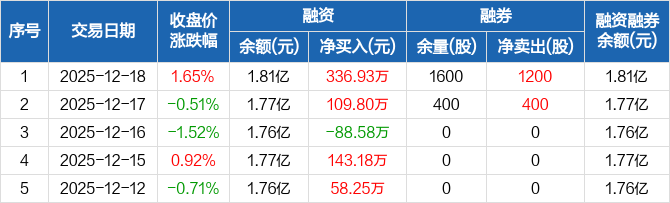 中路股份融资融券信息显示,2025年12月18日融资净买入336.93万元;融资余额1.81亿元,较前一日增加1.9%