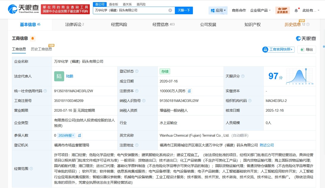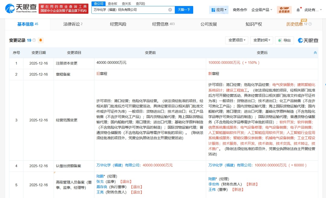 每经AI快讯,天眼查App显示,近日,万华化学(福建)码头有限公司发生工商变更,注册资本由4亿元人民币增至10亿元人民币,同时,部分高管也发生变更。该公司成立于2020年7月,法定代表人为陆鹏,经营范围含港口经营、危险化学品经营、电气安装服务、建筑智能化系统设计、货物进出口、国内货物运输代理、进出口代理、基础化学原料制造、人工智能基础软件开发等,由万华化学(600309)旗下万华化学(福建)有限公司全资持股。