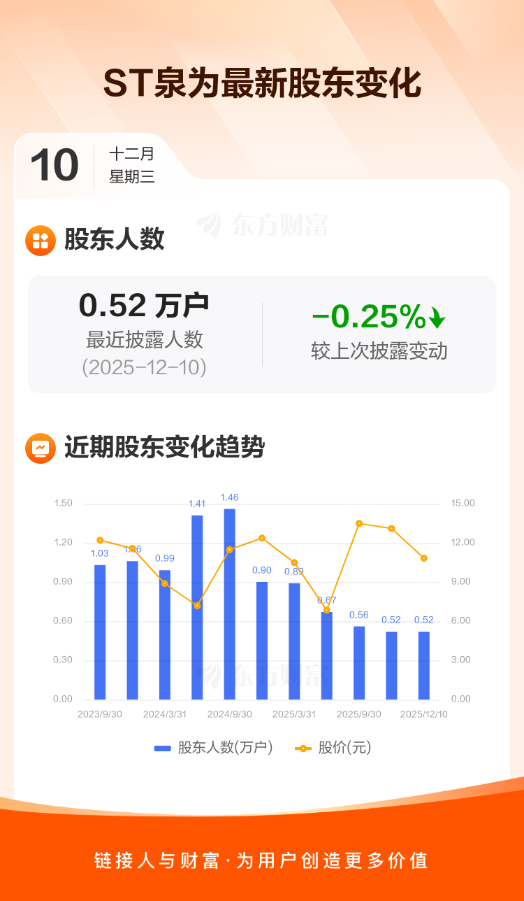 ST泉为最新披露数据显示,截至12月10日公司股东户数为5219户,较上期(2025年10月31日)减少13户,降幅为0.25%。户均持有流通股数量由上期的3.06万股上升至3.07万股,户均持股金额由上期的40.07万元减少至33.18万元。