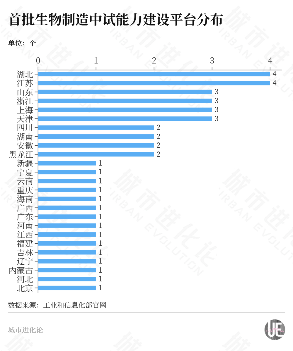 中试平台数量一定程度上反映了各地的产业转化能力。从此次公布的名单来看,34个平台分布在全国25个省份中。从入选数量来看,江苏、湖北各有4个平台入选,排名第一,位列其后的天津、上海、浙江、山东,各有3个平台入选。