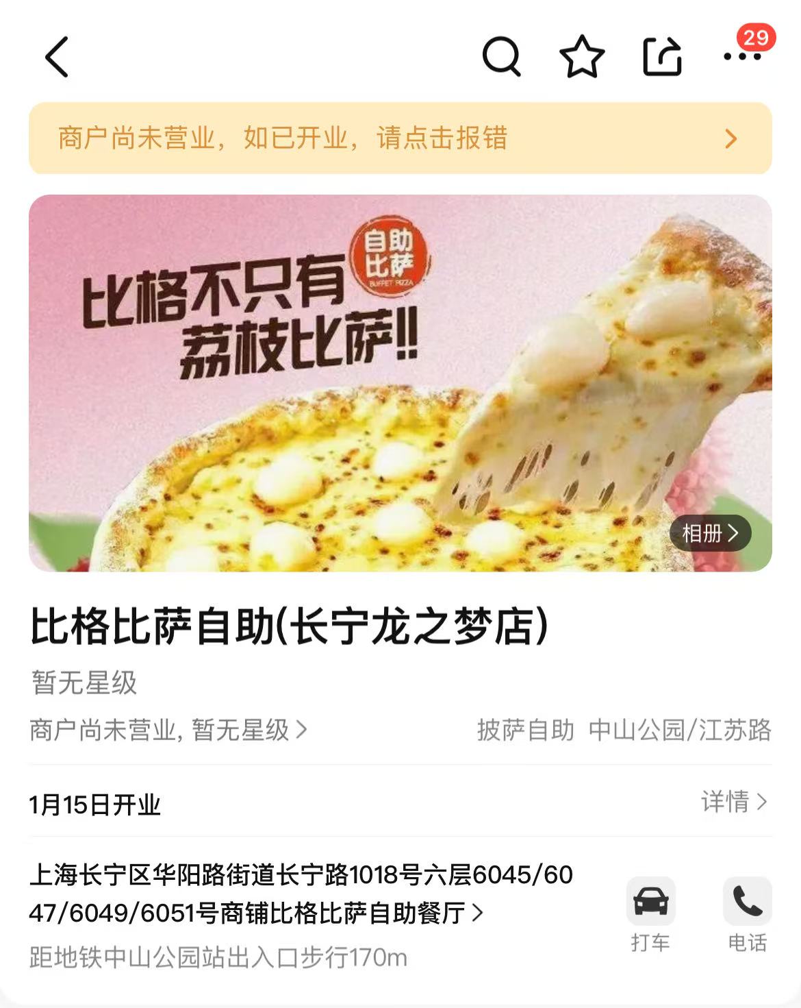界面新闻获悉,比格比萨自助要在上海长宁龙之梦开店,在大众点评该门店已被收录,最新显示将于2026年1月15日开业。比格比萨品牌方对界面新闻确认了这家新店的开店计划。