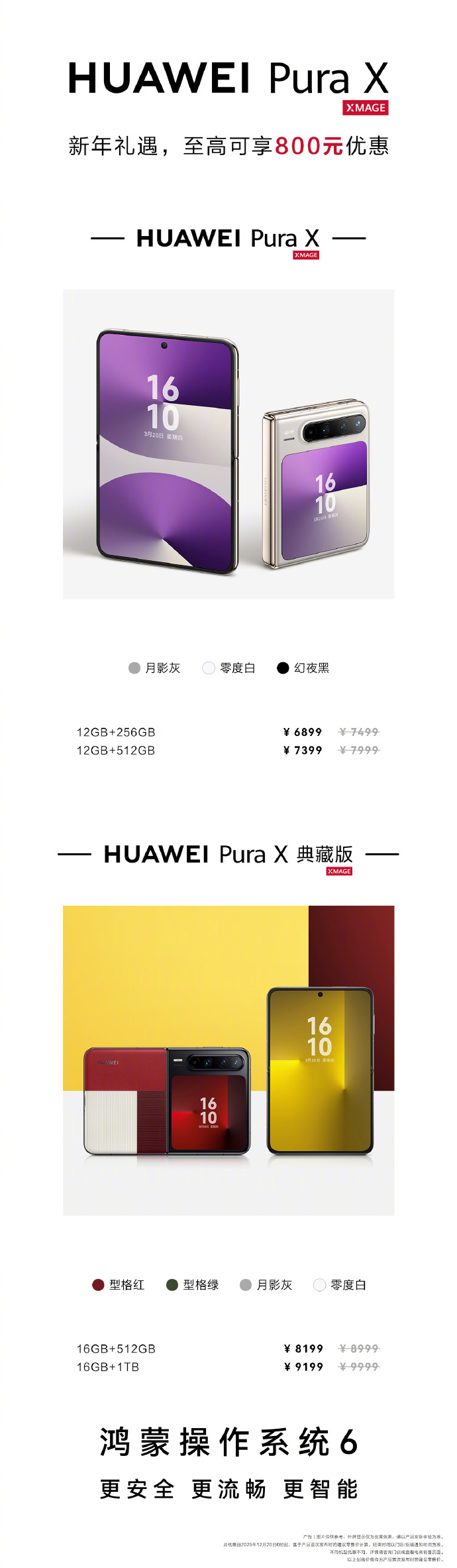 12月20日,华为终端宣布,华为阔折叠手机Pura X开启降价优惠,标准版优惠600元,优惠后6899元起,典藏版优惠800元,优惠后8199元起。