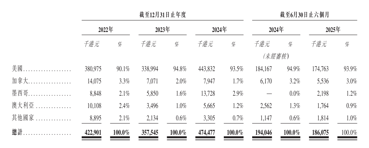 值得注意的是,环球园艺高度依赖美国市场。据招股书,报告期(2022年至2024年度、2025年上半年)各期,环球园艺来自美国市场的收入分别占总收入的90.1%、94.8%、93.5%、93.9%。
