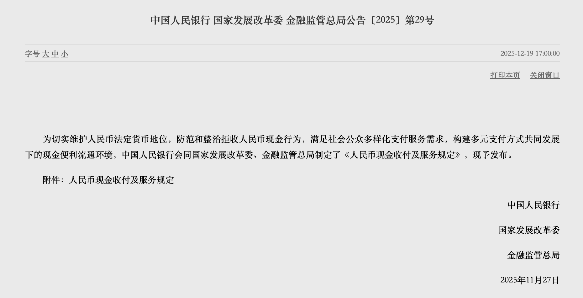 12月19日,中国人民银行会同国家发展改革委、金融监管总局联合发布《人民币现金收付及服务规定》(以下简称《规定》),明确自2026年2月1日起,行政机关、事业单位、公共服务机构及各类经营主体,不得随意拒收人民币现金,不得对现金支付采取歧视性措施。