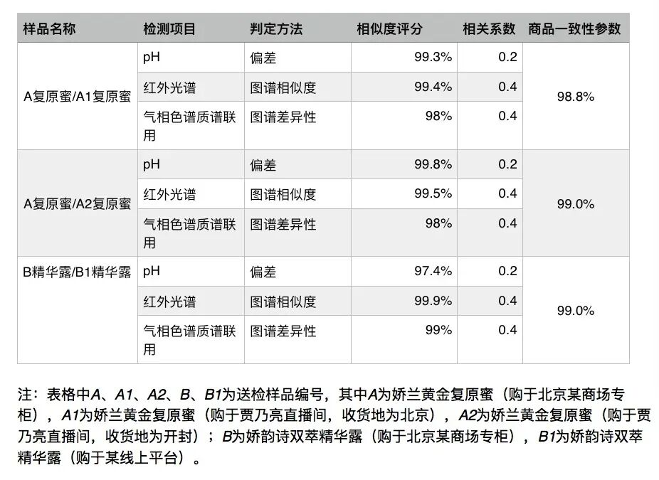 检测结果显示,从比对项目结果分析来看,从直播间购买的娇兰黄金复原蜜(北京收货)与专柜购买的产品一致性参数为98.8%,包装一致;直播间购买的娇兰黄金复原蜜(开封收货)与专柜购买的产品一致性参数为99.00%,包装一致。娇韵诗双萃精华露检测结果显示,专柜与直播间分别购买的两款产品一致性参数为99%,包装一致。