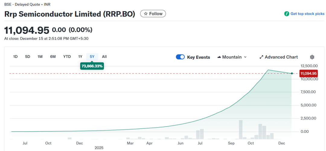 而股价的狂飙,几乎与基本面无关:RRP Semiconductor在最新财报中录得负营收,最新年报显示仅有两名全职员工,而且在2024年初从地产业务转向后,它与半导体投资热潮之间的联系也十分牵强。网络炒作、极小的自由流通盘,以及印度不断壮大的散户群体,共同推动了该股连续149个交易日涨停